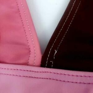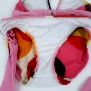 Limited Too Girls Bikini Mod Circles 6/7 Two Piece. Soo cute! Has a loose thread on the bikini top as shown and tie has some discoloration from where it was tied, otherwise great preowned condition. 60's Style Mod Bikini for little girls in pink, orange, yellow, and brown.
