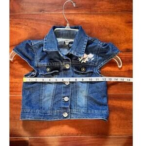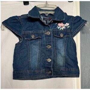 Adorable Limited Too girls denim vest jacket featuring floral embroidery on the chest and classic button-front styling. Medium-wash denim with cap sleeves and front pockets. Perfect for layering over dresses, tees, or summer outfits. In great preowned condition with normal light wear.