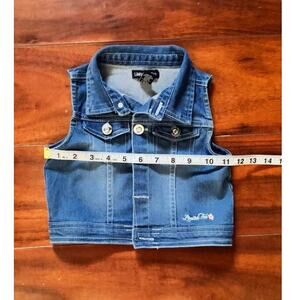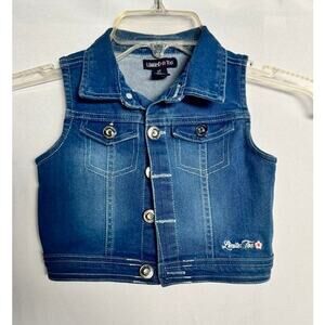 Adorable Limited Too girls denim vest in size 3T. Features a classic medium-wash denim, button-front closure, chest pockets, and the signature Limited Too embroidered logo near the hem. Perfect for layering over dresses, tees, or fall outfits.