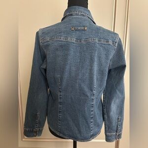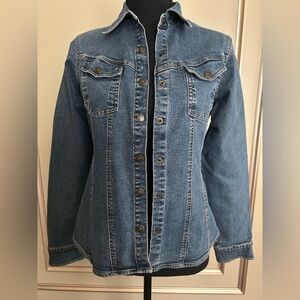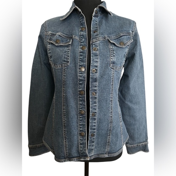 limited too y2k jacket, stretch denim button front, fitted jean jacket, vintage mall brand, nostalgic 2000s fashion, early 00s jacket, y2k revival trend, y2k closet essential, vintage limited too jacket, gen z retro style, princess seam denim, made in hong kong y2k, millennium style jacket, mid wash blue denim, retro mall girl look, fitted stretchy jean jacket, rare y2k denim find, collectible limited too, junior y2k outerwear