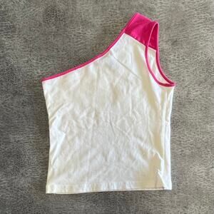 -Y2K one-shoulder tank in white with hot pink trim and strap. Features a bold “02” graphic with flowers, flamingos, and tropical vibes — super nostalgic early 2000s style. Fitted cut and soft cotton feel, perfect for summer, layering, or throwing on with low-rise jeans or a mini skirt for a full throwback look.