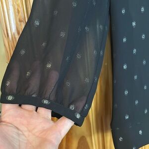 This blouse is super cute. It is sheer black with silver specs and a tie in the front as shown in the picture. Excellent, preowned condition.