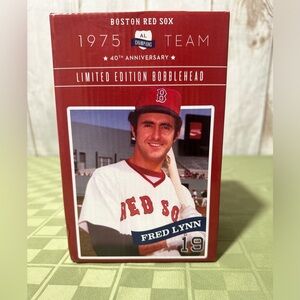 The FRED LYNN Boston Red Sox 1975 Season Bobblehead is an officially licensed collectible featuring the legendary player from the Major League Baseball era. This stadium giveaway item commemorates the 1975 season 40th anniversary and is a must-have for any Boston Red Sox fan. The bobblehead showcases Lynn's iconic look and is a perfect addition to any sports memorabilia collection, celebrating one of the greatest players to ever wear the Boston Red Sox uniform.
