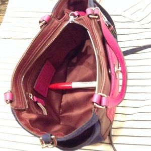 Navy blue suede, maroon and pink quilted leather. Small but surprisingly roomy.