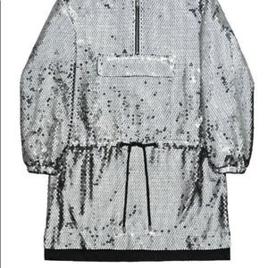 Moschino x H&M RARE Silver Sequin Mini Dress / Quarter Zip Tunic designed by Moschino’s Jeremy-Scott for the Moschino x H&M’s “H&Moschino” haute couture collaboration in 2018. This can be worn as a long hoodie or a dress, whichever you choose you’ll be sure to SHINE! Silver reflective sequins. Pristine condition, NWT. Silky lining inside ensures the sequins can’t be felt. A rare collectors piece seen on celebrities & models like Gigi Hadid (see pic). SZ S (“oversized” fit).