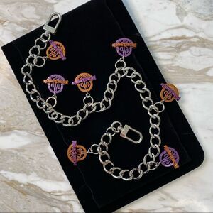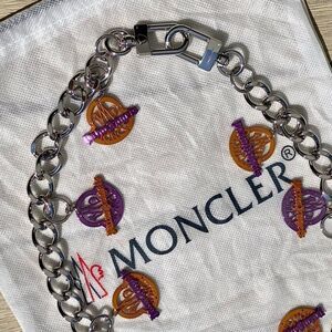 RARE Moncler x Palm Angels 2019 Genius 8 Collaboration Silver Chain Necklace / Chain Belt (you can clip it on anything, use as a wallet chain, bag charm, belt or jewelry) SOLD-OUT everywhere! Very very limited # produced. Never-worn flawless condition. Comes with original dust-bag + copy of the redacted receipt from Moncler Soho Boutique. Features seven (7) “keychain” type pendants of the purple & orange Moncler x Palm Angels logo with clips on each end. Made in Italy. 100% Authentic 🔥32.5”L