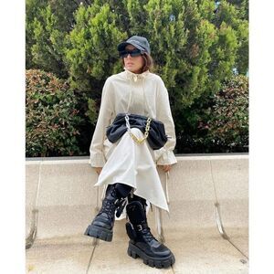 LONG SLEEVE DRESS WITH ADJUSTABLE DRAWSTRING HIGH COLLAR. FRONT POCKETS. ADJUSTABLE WAIST. SIDE VENTS AT HEM. FRONT HIDDEN ZIP CLOSURE.