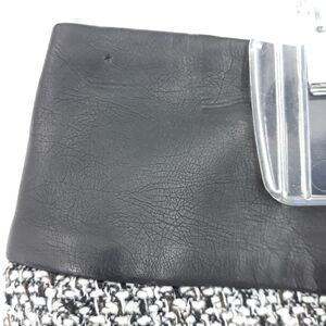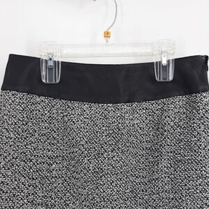 Black and white fully lined tweed mini skirt with faux Vegan leather waistband accent side zipper entry by The Limited.