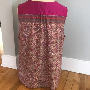 The Limited silky camel/cream/pink/light violet print sleeveless top. Fuschia back yoke that extend onto front shoulder and edges faux collar creating loose center front bands. Yoke with center gathers below. 100% polyester. Size large. New, no tags. Nonsmoking home.