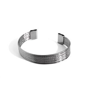 Layer after layer of plain and twisted gunmetal wires stack into an edgy cuff around the wrist, creating an intense metallic centerpiece.