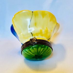 A porcelain box has been formed in the shape of a stunning blue and yellow petal flower. The flower sits on a lovely rounded base with a green leaf pattern. The border between the upper and lower parts has a brass tone border with a flower clasp. This dainty piece is a wonderful example of Limoges porcelain’s attention to detail and beauty. This box is in excellent condition.