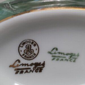 Limoges France porcelain Trinket Box Oval shape. It has a beautiful shiny enamel finish. It is marbled green with gold colored accents and the design of the Effiel Tower on the lid. It is 5 inches by almost 3 inches. It is vintage but not previously owned. It was stored in bubble wrap and an airtight box. It will be carefully bubble-wrapped and double boxed prior to shipping.