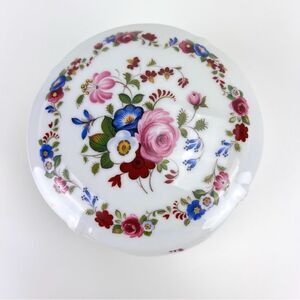 Vintage LEC LeClair Limoges Porcelain Powder Jewelry Trinket Jar Box from France. Crafted with exceptional attention to detail, this elegant porcelain box features intricate floral designs that add a touch of timeless beauty. Measuring 4 1/2 inches wide and 3 inches tall (with lid), this trinket jar is in good condition with no chips or cracks.