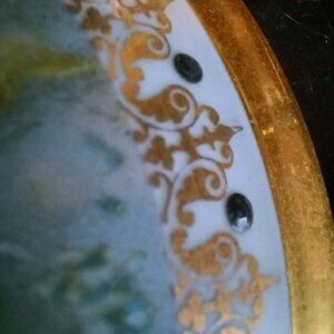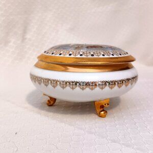 This is a Madeleine Sezille Limoges France trinket box - beautiful hand-painted cherubs frolicking amongst doves and flowers. Delicate gold trim hand painted along the edge of lid and box. The feet are also painted gold.