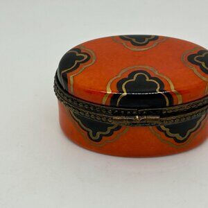 Limoges Oval Trinket Box Handprinted in France Brass Accents Orange-Black Design