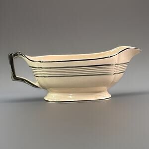 Vintage Limoges USA Gravy Boat with scalloped corners and bold black line accents. A rare American Limoges Art Deco–inspired dinnerware set, perfect for collectors or vintage table settings.
