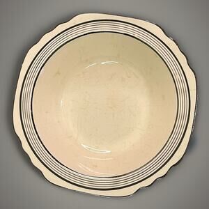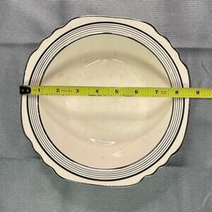 Vintage Limoges USA plates made in Sebring, Ohio, featuring a unique octagon shape with scalloped corners and bold black line accents. Bowl measures about 8.5 inches and shows natural age-related crazing. A rare American Limoges Art Deco–inspired dinnerware set, perfect for collectors or vintage table settings.