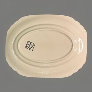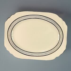 Vintage Limoges USA Platter was made in Sebring, Ohio, featuring a unique octagon shape with scalloped corners and bold black line accents. Platter measures about 11 inches and shows natural age-related crazing. A rare American Limoges Art Deco–inspired dinnerware set, perfect for collectors or vintage table settings.