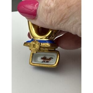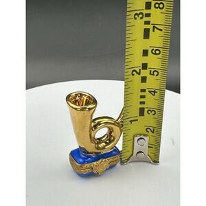 Tiny Limoges Peint Mein trinket box. It is in the shape of an English Hunting Horn. It is hand painted porcelain in a deep blue color with gold highlights. The interior features a little red fox. It is signed Artoria, Peint Mein, Limoges, France. It is numbered #6 and signed with the artist's initials G. B. It is 1.75" tall, 1.5" in length and .5" wide. It weighs less than an ounce. It would be a great addition to anyone's Limoges box collection! It is in excellent condition with no chips or damage.