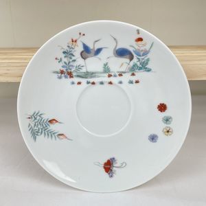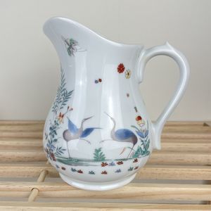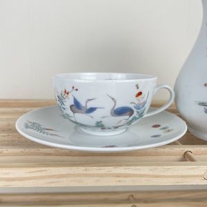 Limoges France Porcelain du Lys Royal "Kakiemon" reproduction decor small pitcher, teacup, and saucer set. Hand painted cranes and Japanese floral design. Excellent condition! Pitcher measures approximately 6" tall.