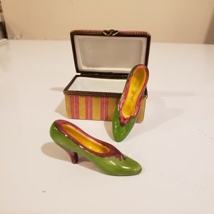 Limoges shoes and shoe box. Pink and Green shoes. Top of box says Mode de Paris. Comes with certificate of authenticity and original box. Retired