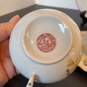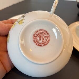 Limoges France Véritable Porcelaine 3 Teacups, 3 Saucers and 1 Plate. A lovely pattern is yellow flowers with green leaves on white. Edges of Cups, Cup Handles, Saucers and Plate are edged in gold trim. Sizes: Plate 7in Diameter; Saucer 5.5in Diameter; Cup 3.75in Diameter H 1.75in. Very Good condition. This is a way to enjoy different China patterns! This set would make a great coffee/ tea desert set with a couple friends.