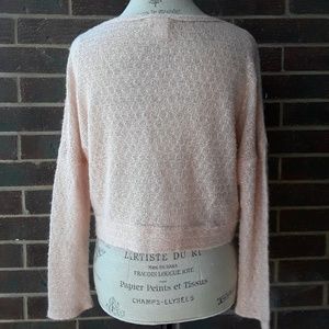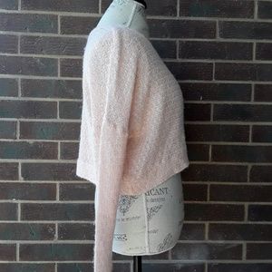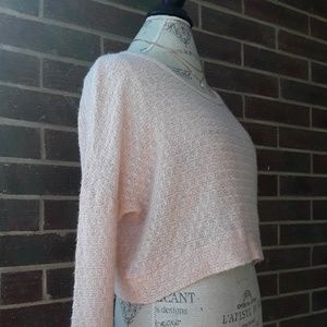 Sweet blush pink wool blend sweater. Doesn't show up in the pictures, but there is also a shimmer thread that runs through the sweater. Size unknown, small is my best guess, see measurements below.