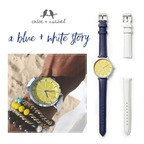 • Navy Blue and White Leather Band/Lemon Yellow Face/Shiny Silver Plated/3 Hand Japanese Movement/40mm Watch Case/Approximately 9.5"/Adjustable Straps/Buckle Closure