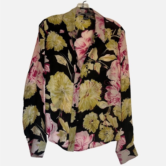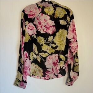 Stunning 100% silk button-front blouse by Linda Allard for Ellen Tracy. Features a bold oversized floral print in shades of lime green, pink, and ivory against a black background. Long sleeves with cuffed button closures. Lightweight and luxurious, this statement top is new with tags (original MSRP $220).
