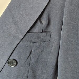 A sophisticated 100% silk blazer from Linda Allard for Ellen Tracy, designed in a deep navy blue with a sleek double-breasted silhouette. Luxuriously soft with subtle sheen and impeccable tailoring.