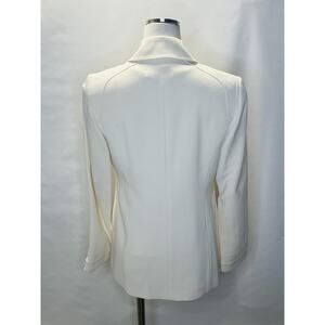 This set includes a blazer-style jacket and v-neck shell tank top in matching ivory optic white tones. The jacket features a button front closure, pointed collar, additional matching fabric belt with buckle, tailored seams, and full satin lining. Includes original belt. Size tag reads 2 on jacket and XS on top.