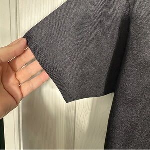 Linda Allard for Ellen Tracy black top. Short sleeve, rib knit cuffs and hem. 85% silk/12% nylon/2% spandex. Stretch. No size tag on the garment, so please check measurements carefully to ensure fit. Please note this is a true black color -- the photos make it look like a light black, but it's not.