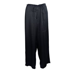 Elegant black silk satin wide leg pants featuring zippered front and high drawstring waist brings the comfort and effortlessness of pajamas with the elegance of evening wear.