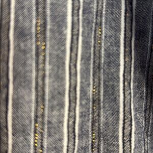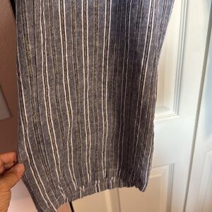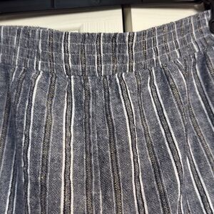 Comfortable wide legged linen blend travel pants with elastic waistband. Navy and white striped with gold metallic threading. No pockets.