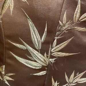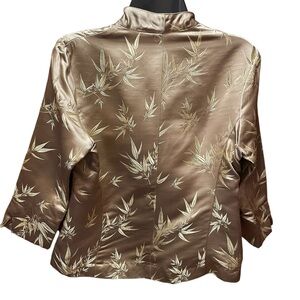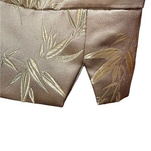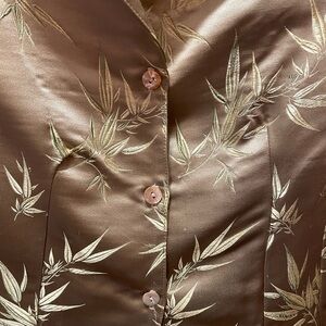 Great blazer for the holidays!! Linda Bertozzi gold embroidered, brocade like button front blazer. 100% rayon. Gold color verging into tan not yellow. In excellent condition.Sizing tag only states petite so please see measurements below.