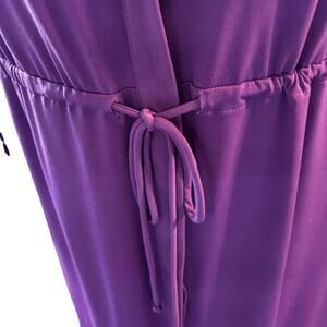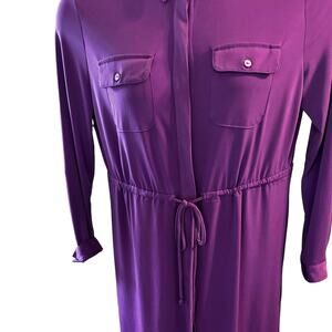 The shirt dress is preowned without stains, rips, or tears. The color of the dress is a trending color in the fashion industry. The color is Violet. The shirt dress is a simple but elegant style that is timeless. The measurements are taken lying flat