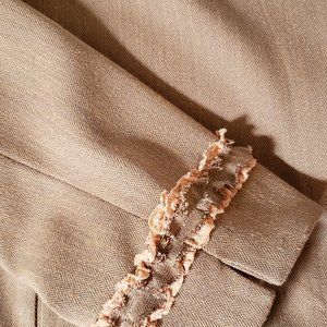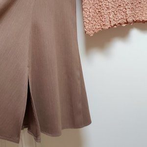 The button closure and the zipper of the skirt are off center and in line with the slit at the hem.