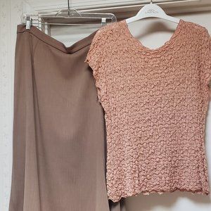The co-ordinating top is made of 75 % Rayon, 20 % Nylon and 5 % Spandex and is quite soft to the touch. It is stretchy. Hand wash and lie flat to dry.