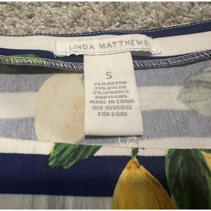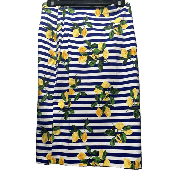 Linda Matthews Lemon Print Striped Skirt Women’s Small Blue White Fruit A-Line