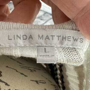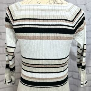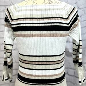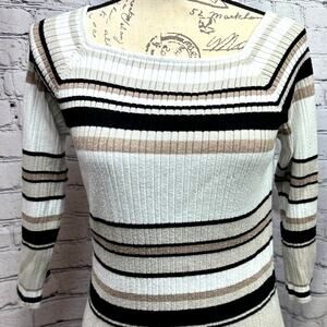 Linda Matthews Pullover Striped Sweater Black Taupe White Square Neck L