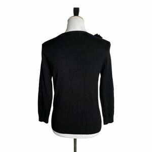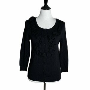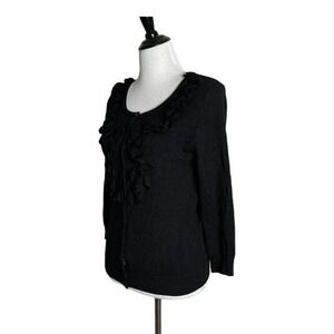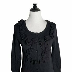 Linda Matthews Ruffle Cardigan Sweater Women MP Black Cozy Soft Preppy Office