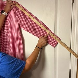 This is one of the most handsome shirts for a man. The color stands out and looks very professional. It is in great condition and it has 2 small thread places as you can see in the pictures ,but they are very unnoticeable. Please see the pictures for details and measurements. You will not be disappointed with this one! It is a 16 inch neck size and 32 or 33 inch sleeve length with extra buttons just in case.