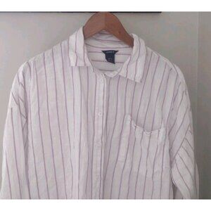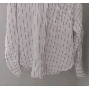 Lindex Linen Blend Button Down Top. Size UK Small 4-6. White and purple stripe. Lagenlook, preppy, academia, classic. In nice, preowned condition. Measures approximately 23' pit to pit, 25" shoulder to hem (loose, relaxed fit).