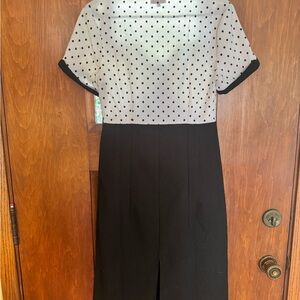 Chic midi dress with polka dot pattern. Features a stylish bow detail. Ideal for versatile wear. Fits like a size 8.