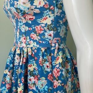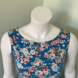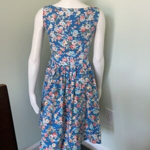 Sleeveless blue floral dress. Yellow and pink flowers. Lined skirt. Size zipper. Belt loops - no belt is included. Preowned
