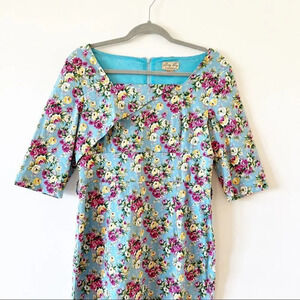 Lindy Bop light blue floral sheath dress size large. Elbow length sleeves and square neckline. Poly elastane blend to accentuate your curves. Back zipper closure. Back slit. Missing belt. Preowned.