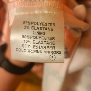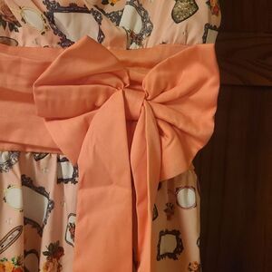 Has attached bow around waist. Zips up side. Unlined. Allover mirror print gives whimsical girly vibes.