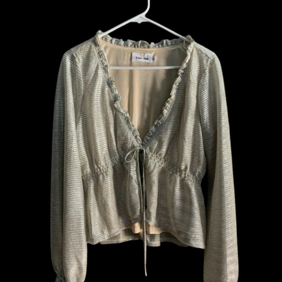 Beautiful Silver threaded blouse. It ties at waist fully lined, you can sexify it by wearing it alone or wear it with a camisole underneath. It has cool billowy sleeves.