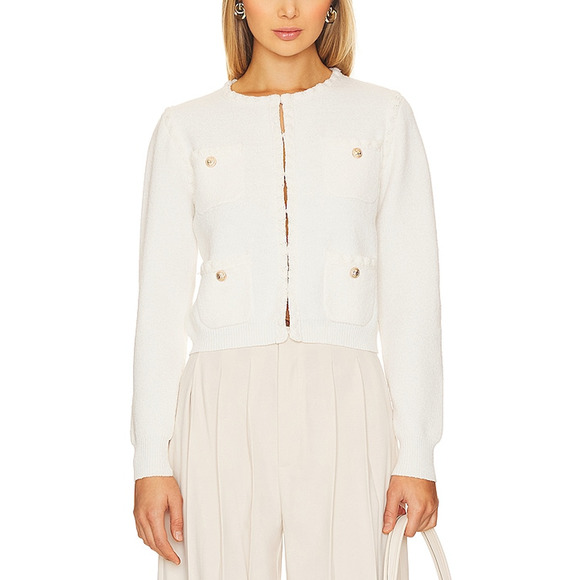 Line & Dot 'Corey' White Sweater Size XS: front hook and eye closure, front slip pockets with gold-tone button accent, midweight knit ponte fabric.