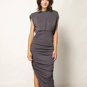 Completely sold out on Revolve! Super sexy midi dress with ruching in all the right places. Super comfortable to wear!
